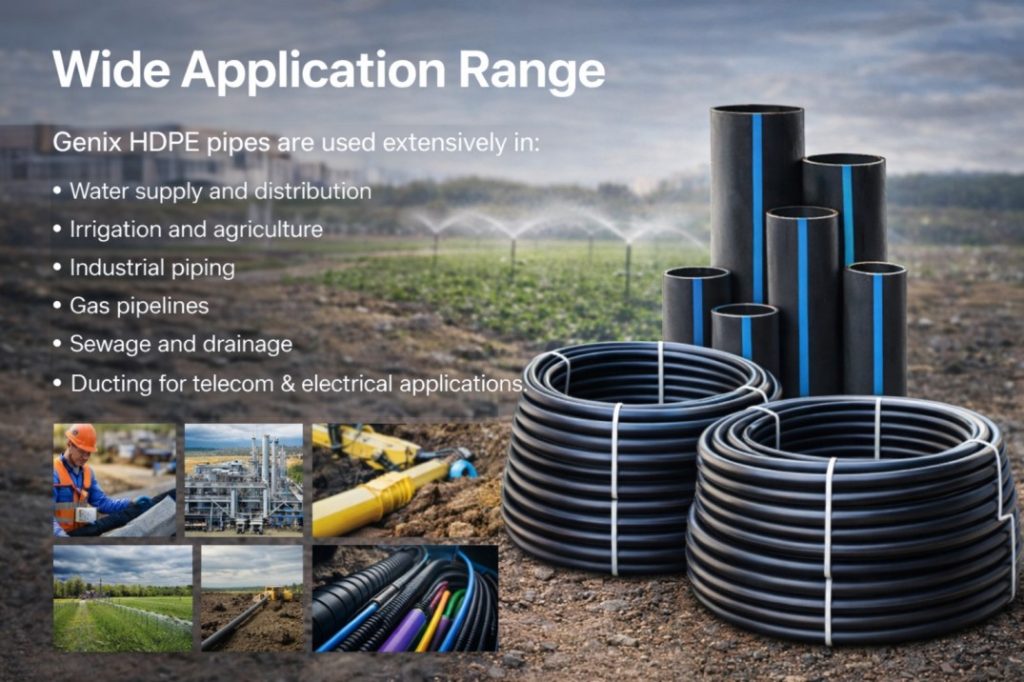 HDPE pipes from Genix Polymers offer a superior combination of strength, flexibility, safety, and long-term durability. Designed to meet modern infrastructure challenges, they deliver unmatched performance across critical applications. Whether you’re building a municipal water network, telecom duct system, or industrial plant pipeline, Genix HDPE pipes are your trusted choice for reliability and excellence.