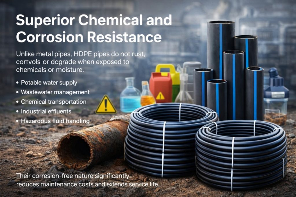 Unlike metal pipes, HDPE pipes do not rust, corrode, or degrade when exposed to chemicals or moisture. This makes them suitable for: