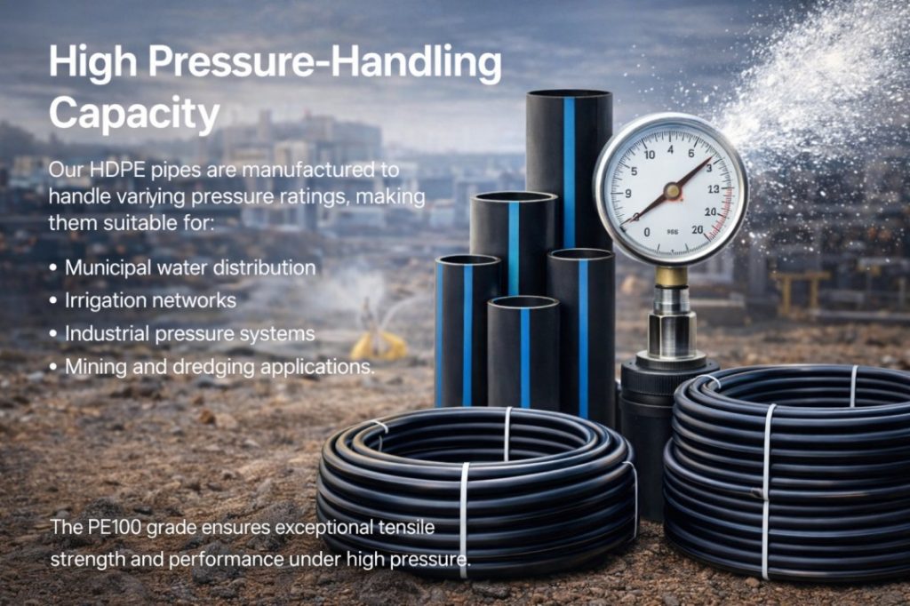 Our HDPE pipes are manufactured to handle varying pressure ratings, making them suitable for: